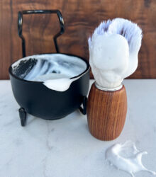 I also have made available a decent-quality wet shaving brush and holder set. I say “decent-quality” because a shaving brush is as individual as the perfect pair of black pumps is to a woman. There are a ton of options out there, ranging from $7 to well over $200 for a shaving brush. What’s in the set?